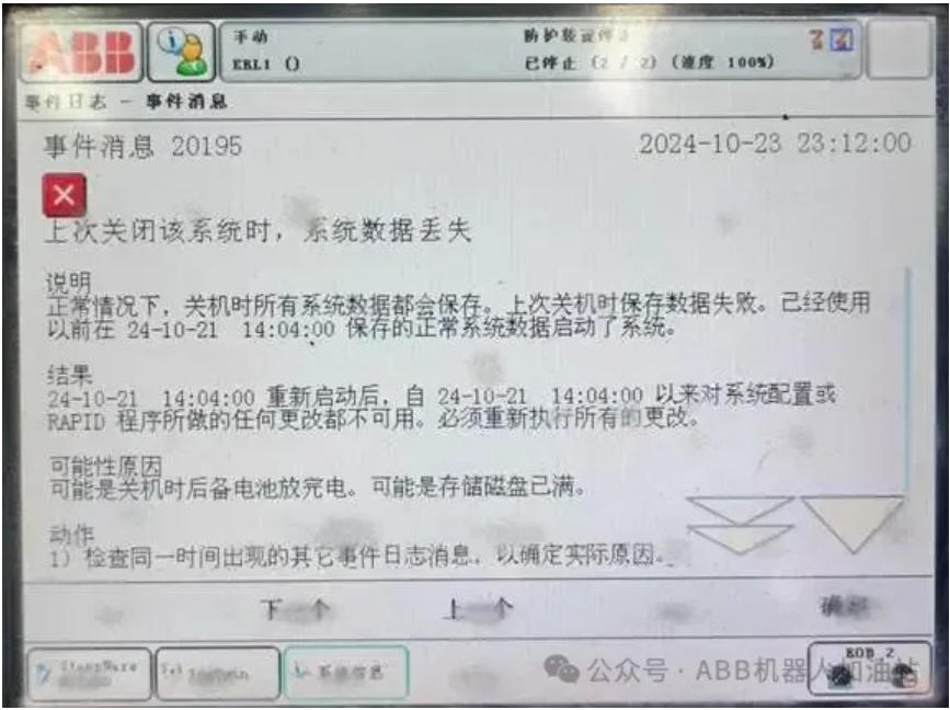 1.通过B-启动(恢复到上次自动报讯的状态),然后再恢复备份让机器人西铜恢复的正常状态,机器人零位还要再更新。