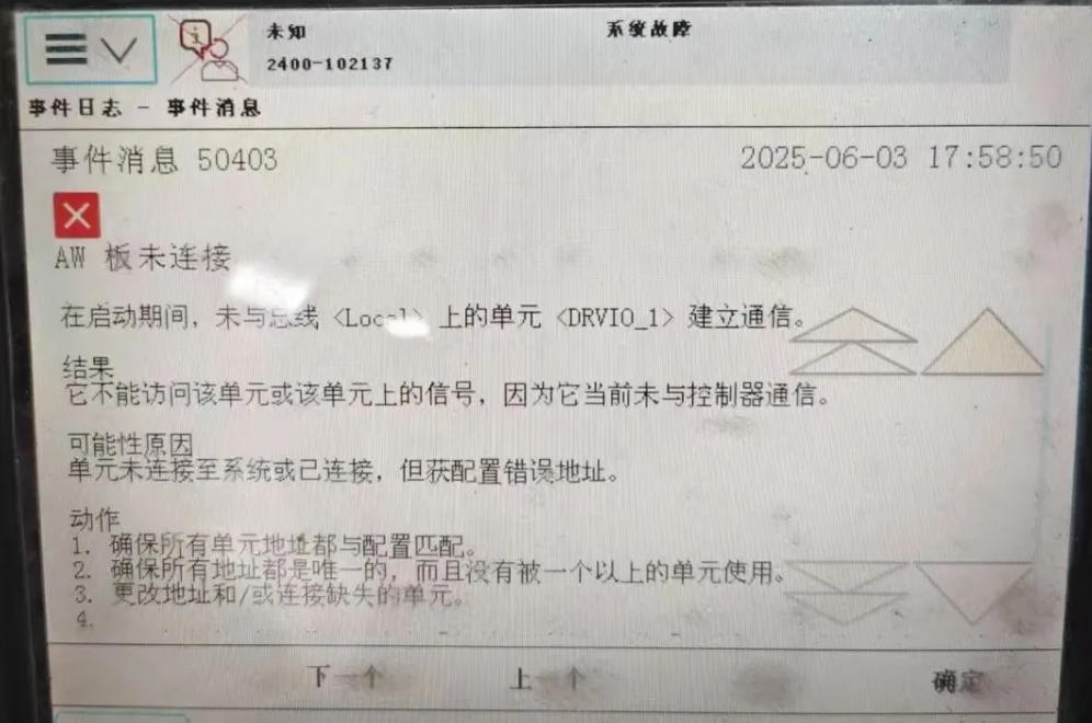 控制系统:IRC5 控制柜:IRC5标准控制柜 应用:弧焊,外部轴转台 故障:机器人出现50403故障,机器人系统失败 故障信息图片: