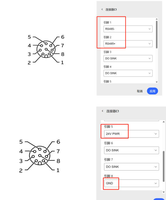 在示教器配置插件中,将引脚1设置为rs485-,引脚2设置为rs485+,引脚5设置为24pwr并通过do将该针脚设置为1,引脚8设置gnd。