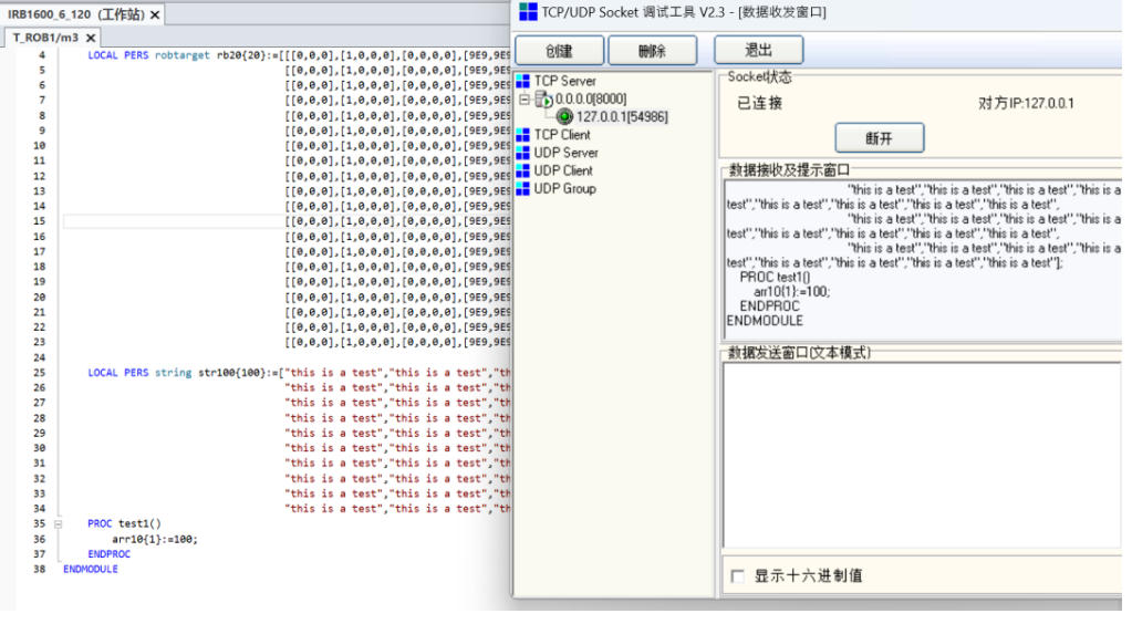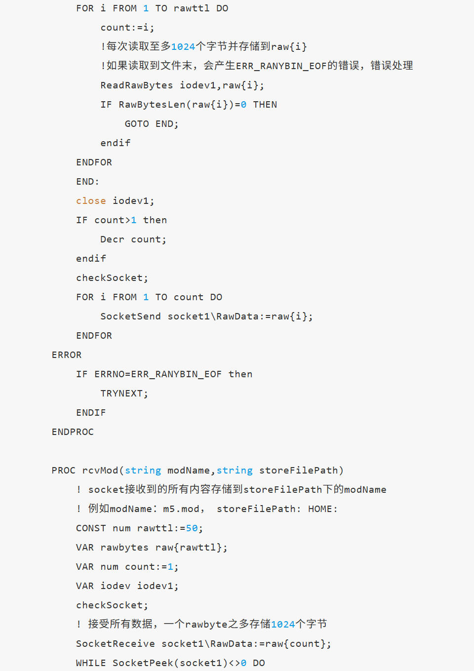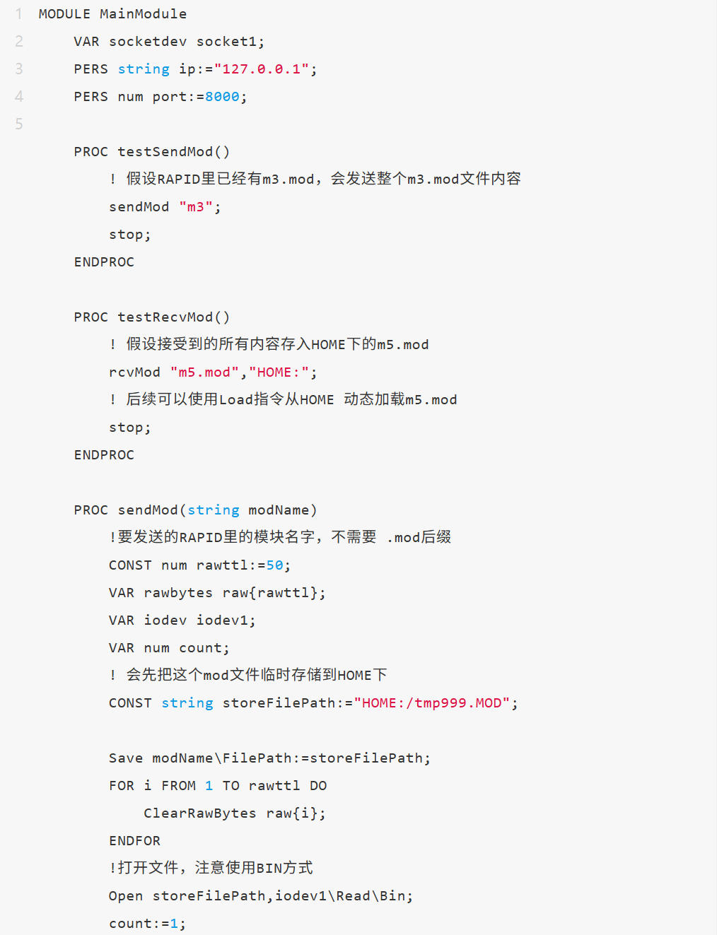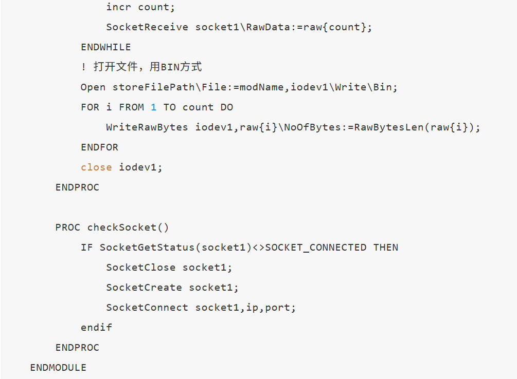1.假设RAPID中有代码m3.mod,里面有数据,有指令,非常多行内容。用户希望通过socket把整个模块内容发给上位机/PLC