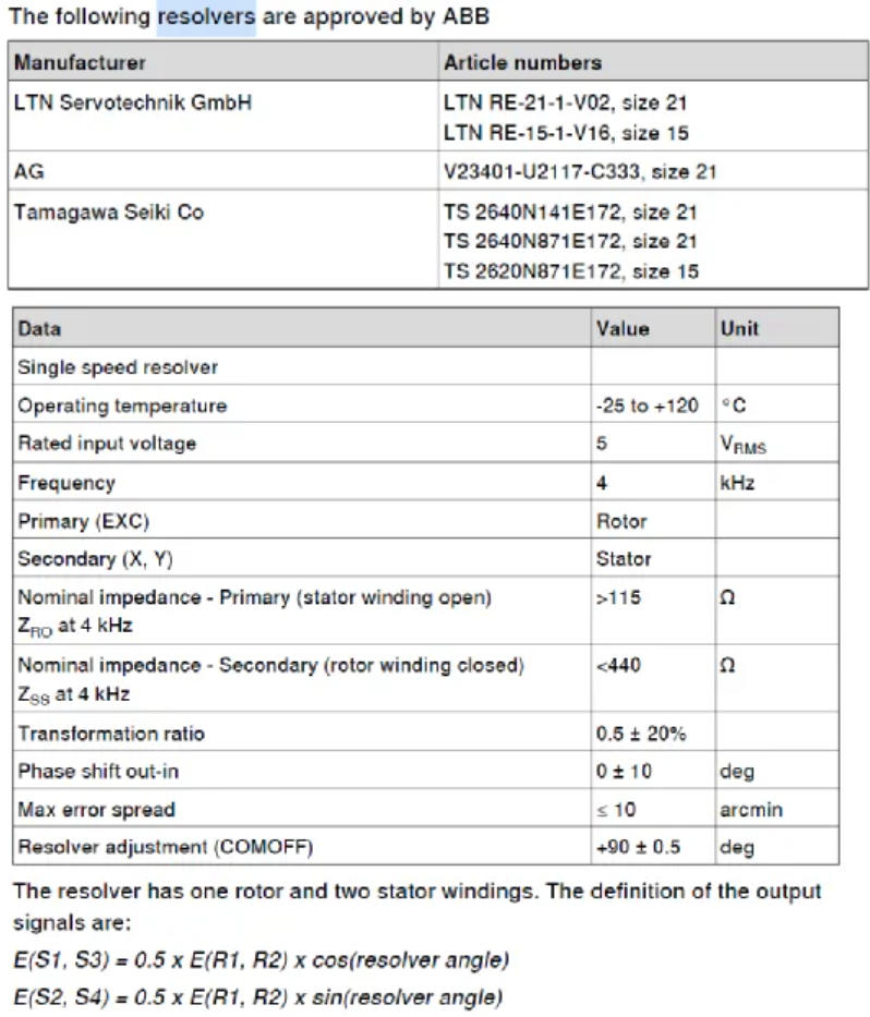 1.ABB机器人外轴伺服电机可以使用第三方电机,电机的编码器类型必须是Resolver。ABB认证的编码器如下,相关参数如下: