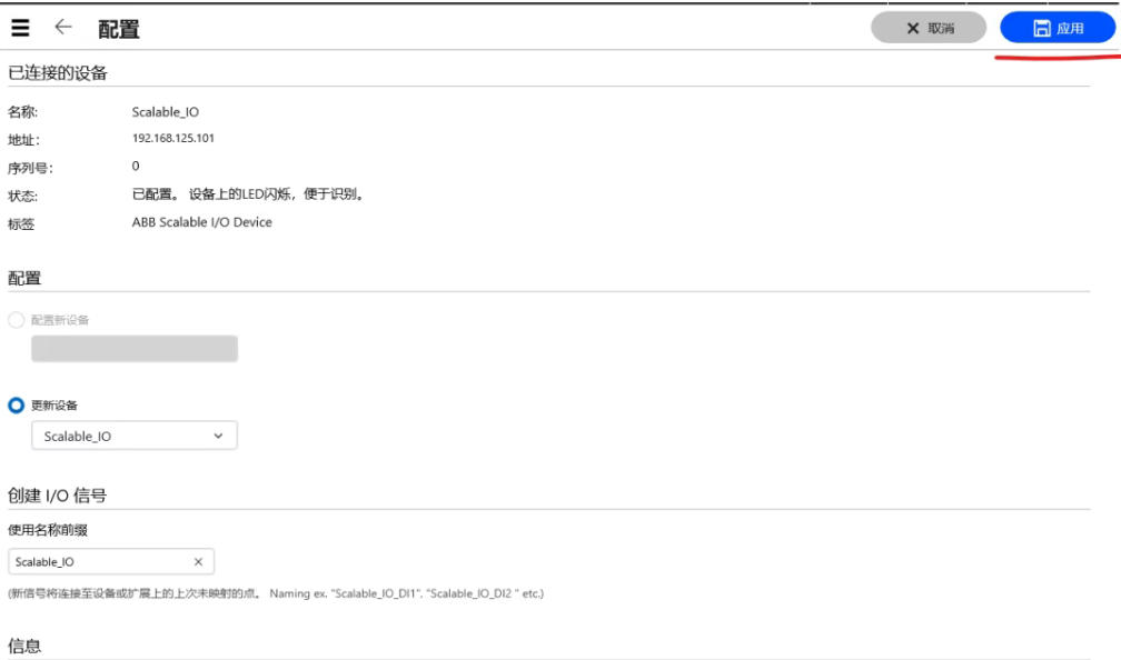 上图中,新加的模块通过外部电源进行供电(也可以通过X19端子供电,模块的正负极均已标记在端子处,接线时切勿接错。通讯的绿色网线从控制柜原来的1030模块引出到达新的1030网口(X3网口和底部的X5网口任选一个即可)。PS:切记如上端子5-6处的工艺电源24V和0V必须接上,不然1032板卡通讯不上!!选择“配置”-----点击“应用”----随后按照提示重启控制器即可: